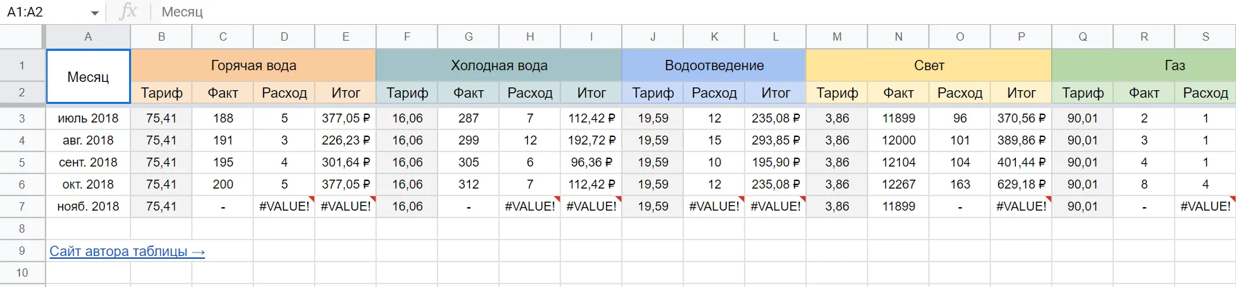 Таблица поможет рассчитать сумму оплаты за коммунальные услуги — водоснабжение, электричество, газ. Здесь нужно указать тарифы, показания счётчиков (фактические) и расход. Сумма платежа будет рассчитана автоматически. Шаблон также можно использовать для отслеживания расходов в динамике.