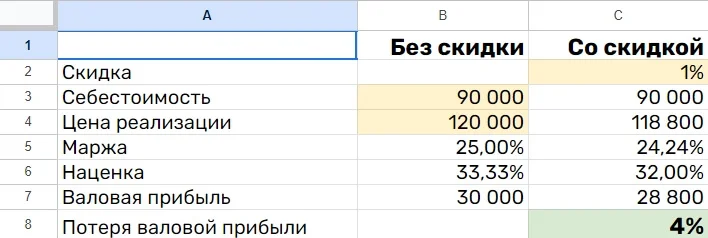 Таблица рассчитает, как повлияет скидка на прибыль компании. Поможет понять, какую скидку вы можете сделать с учетом маржи и наценки, чтобы не уйти в минус.