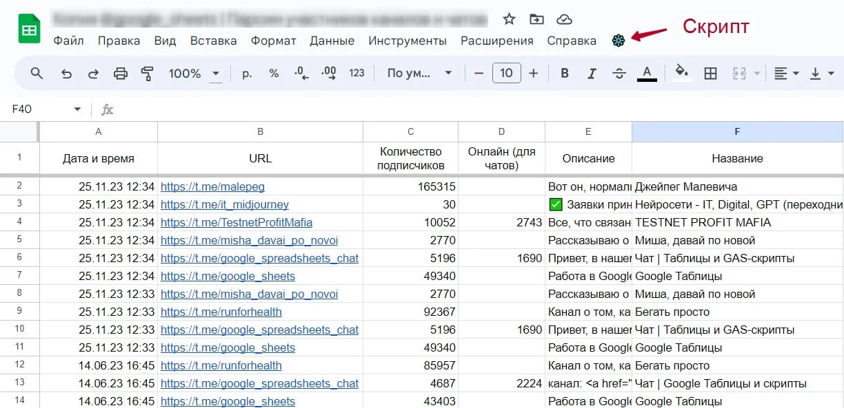 Таблица поможет отследить, насколько эффективную рекламную кампанию вы провели, как растут ваши конкуренты и другие каналы. Чтобы воспользоваться таблицей, скопируйте её, на листе «настройки» добавьте ссылки на нужные каналы и чаты. Затем запустите скрипт, кликнув на иконку «❄️» в меню и откройте лист «результат». Там вы увидите, сколько людей подписано на выбранные каналы.