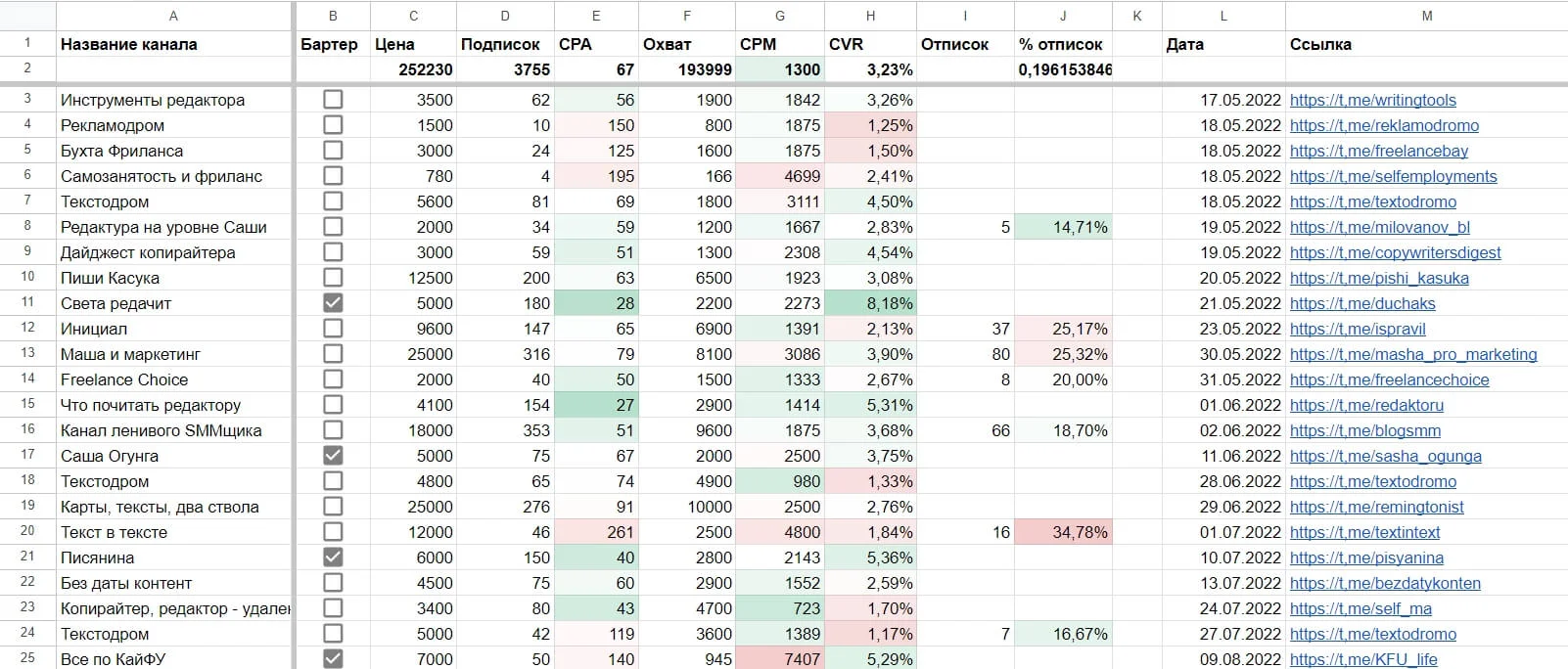 Таблица позволяет учитывать Telegram-каналы, в которых вы размещали рекламу. Записывать цену, количество подписок, CPA, охваты, CPM, % отписок и ссылки на сами каналы.
