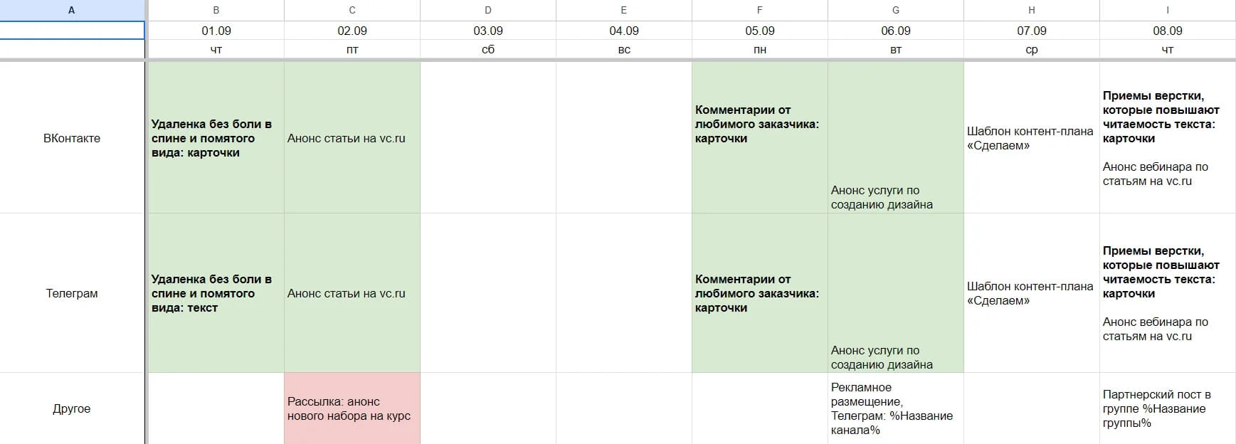 Таблица поможет продумать контент-план на месяц вперед для разных площадок: VK, Telegram, Instagram*. Чтобы работать с таблицей, копируйте ее к себе и прописывайте актуальные даты в верхней строке. А затем расставляйте планируемые публикации по разным датам и площадкам.