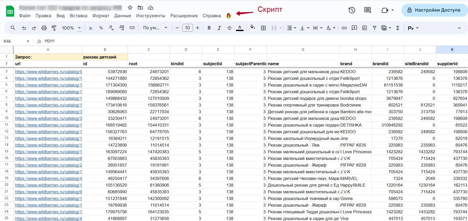 Этот шаблон позволяет выгрузить в таблицу 100 лучших товаров с Wildberries по поисковому запросу. Работает шаблон так: в ячейку B1 вводите свой запрос (например, рюкзак детский). Запускаете скрипт кликом по кнопке «🔥» и в таблицу вставятся результаты запроса. Одна строка — один товар. Сортировки нет. На каждый товар будет добавлена URL-ссылка, бренд, цена, рейтинг, количество отзывов, доступные цвета.