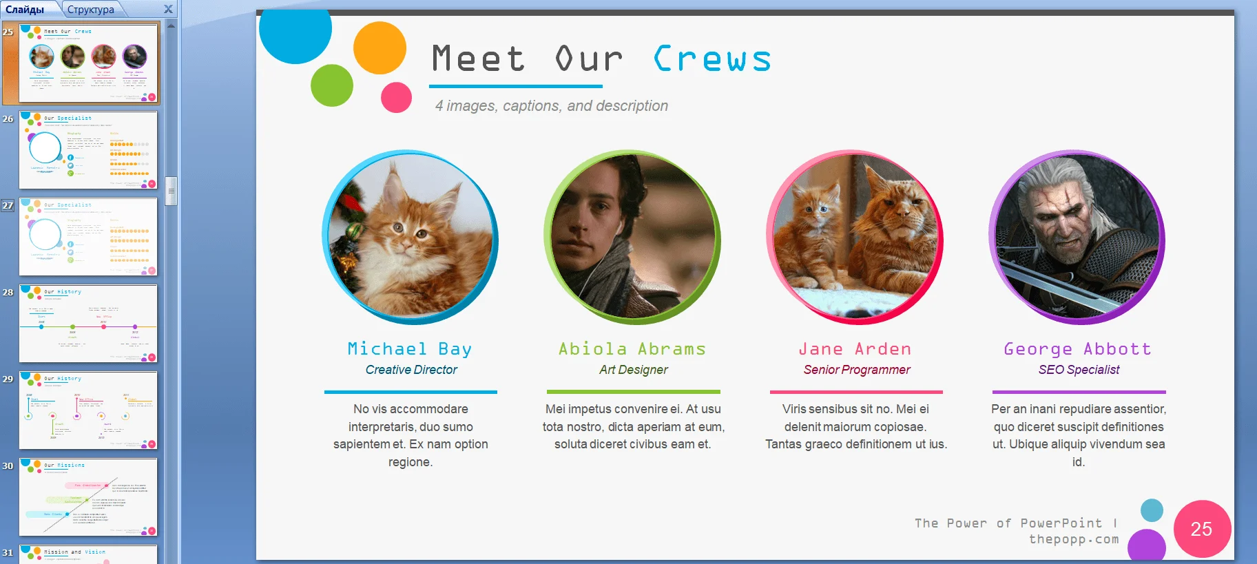 Что входит в шаблон. 80 слайдов, 369 иконок, графики, диаграммы, множество рамок для фото — в частности, для аватаров.