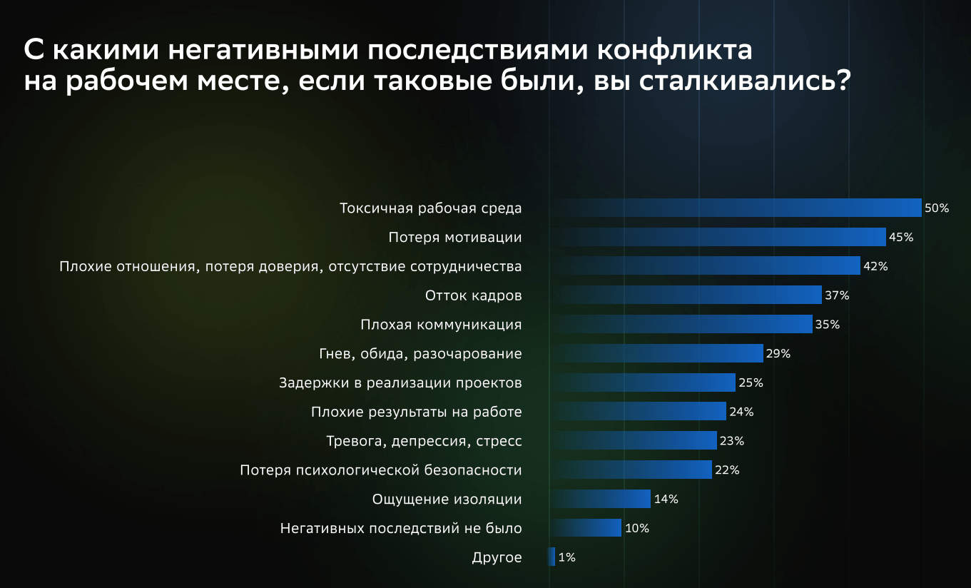 Сплоченность и конфликты. На определенном этапе развития команда сталкивается с разногласиями. Это естественно: у людей разные стили работы, приоритеты и ожидания. И легкое напряжение может быть полезным — оно позволяет команде развиваться, обсуждать, перестраивать процессы. Проблемы начинаются, когда конфликты не проговариваются или игнорируются. В этом случае они уходят в «подполье», становятся личными и начинают разрушать доверие.