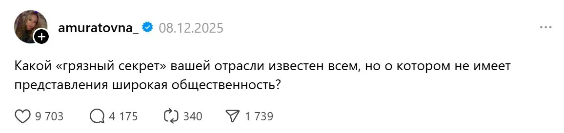 В Threads (соцсеть запрещенной и экстремистской Meta) наткнулся на ветку @amuratovna_, которая собрала миллион просмотров и 15К лайков, комментариев и пересылок.
