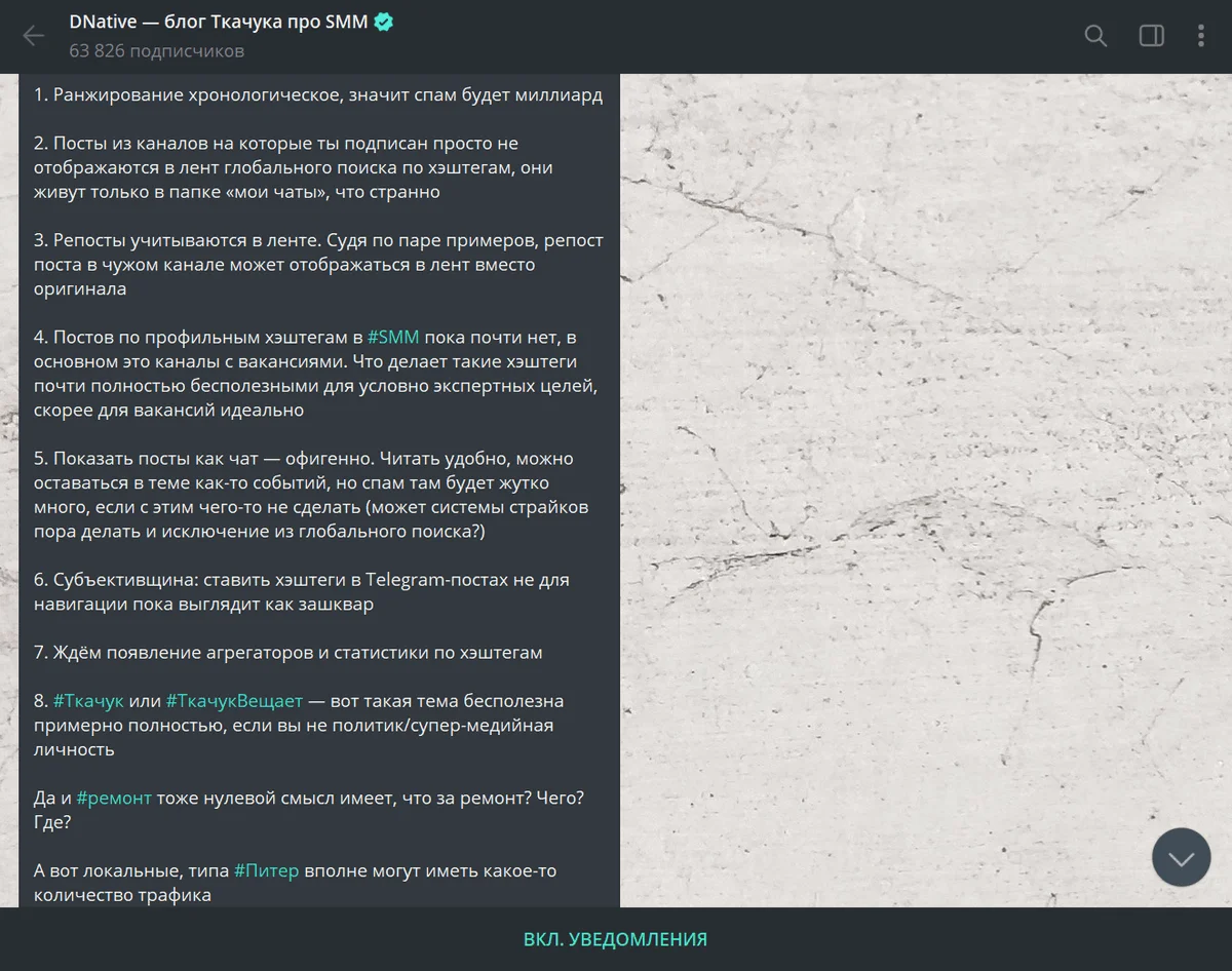 Алексей Ткачук в своём канале DNative поделился мнением об использовании глобальных хештегов на основе первых экспериментов. По его словам, стоит ожидать роста спама из-за того, результаты поиска отображаются в хронологическом порядке. Кроме того, практическое использование усложняет учет в выдаче репостов и отсутствие в глобальной ленте результатов из тех каналов, на которые подписан пользователь. Пока можно предположить, что пользу принесёт использование брендовых или локальных меток.