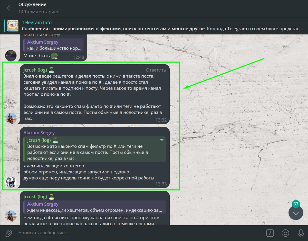 Ну и наконец, самая интересная функция — глобальные хештеги. Теперь поиск по хештегам можно использовать по всем крупным каналам Telegram.