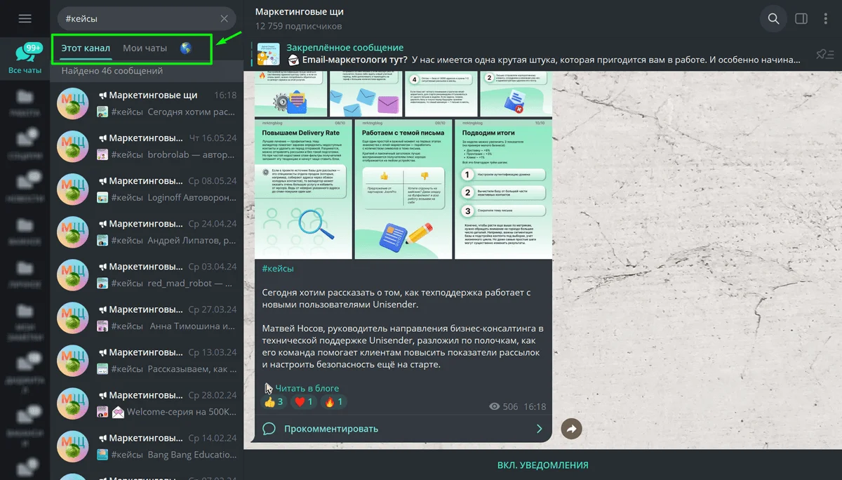 2. В результатах поиска отобразятся три вкладки с результатами, которые помечены аналогичным тегом — «Этот канал», «Мои чаты», «Публичные посты»