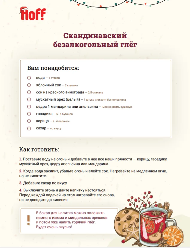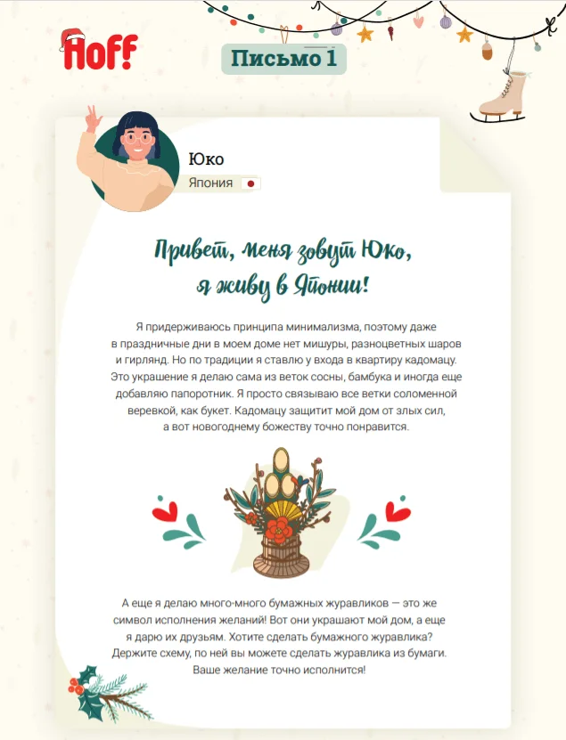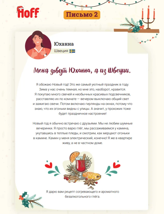 В конце 2021 команда Hoff захотела подарить подписчикам уникальный контент, который позволил бы по-новому взглянуть на письма. Мы и раньше пытались делать оригинальные поздравления к Новому году, но понимали, что это мало выделяло нас среди других компаний. Например, в декабре 2019 г. мы делали серию рассылок с чек-листом по подготовке дома к празднику и завершали её письмом с новогодней открыткой.