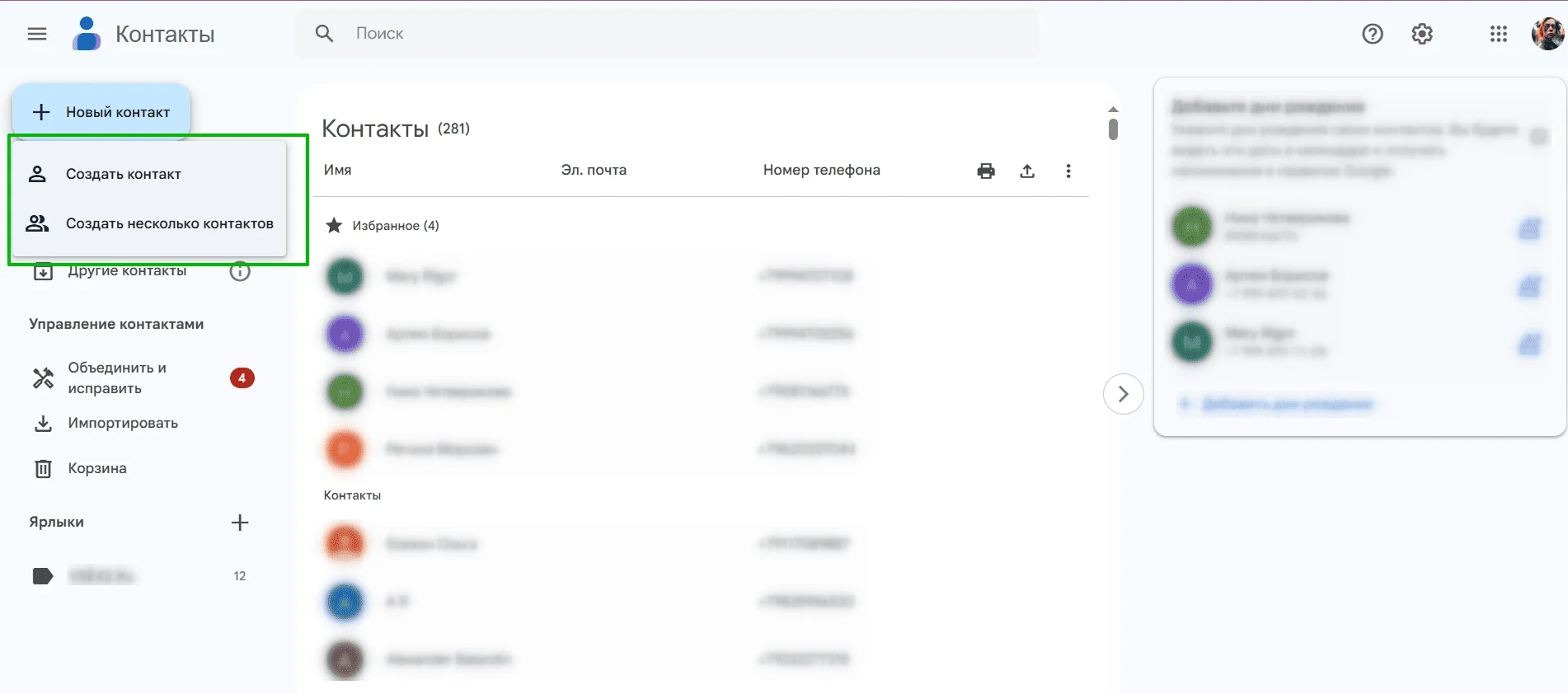 Группу можно создать сразу при добавлении контактов: для этого нужно выбрать опцию «Создать несколько контактов». Gmail сам предложит добавить к ним ярлык.
