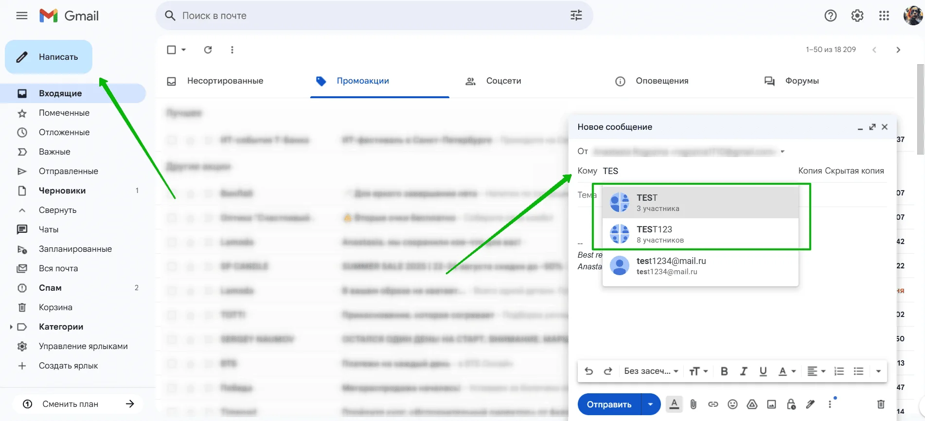 Когда группа создана, всё, что остаётся — написать письмо и отправить его группе. Для этого нажмите кнопку «Написать» в верхнем правом углу Google Почты, в открывшемся окне наберите сообщение, а в адресной строке начните вводить название группы — сервис сам предложит подходящие.