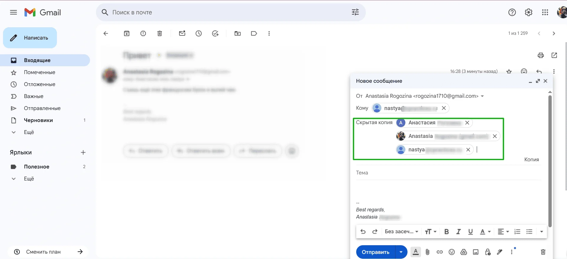 Чтобы адресаты друг друга не видели, нужно добавить людей в скрытую копию. Сделать это можно во время создания письма. Сначала добавьте основного получателя (это можете быть вы сами), а затем нажмите на кнопку «Скрытая копия» и начните вводить имя человека, который также получит письмо. Основной получатель не узнает, что вы отправили письмо ещё кому-то.