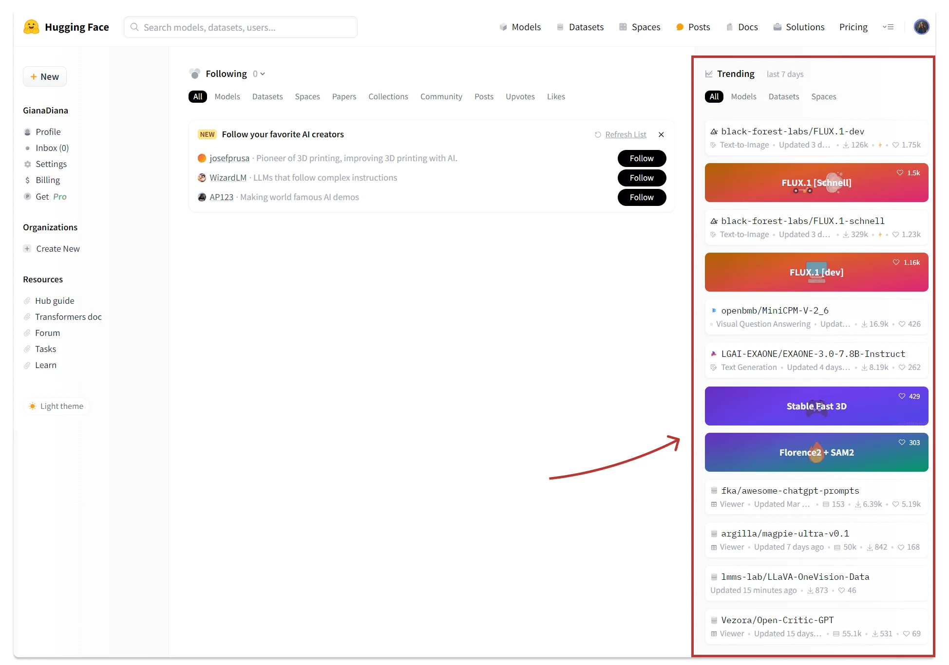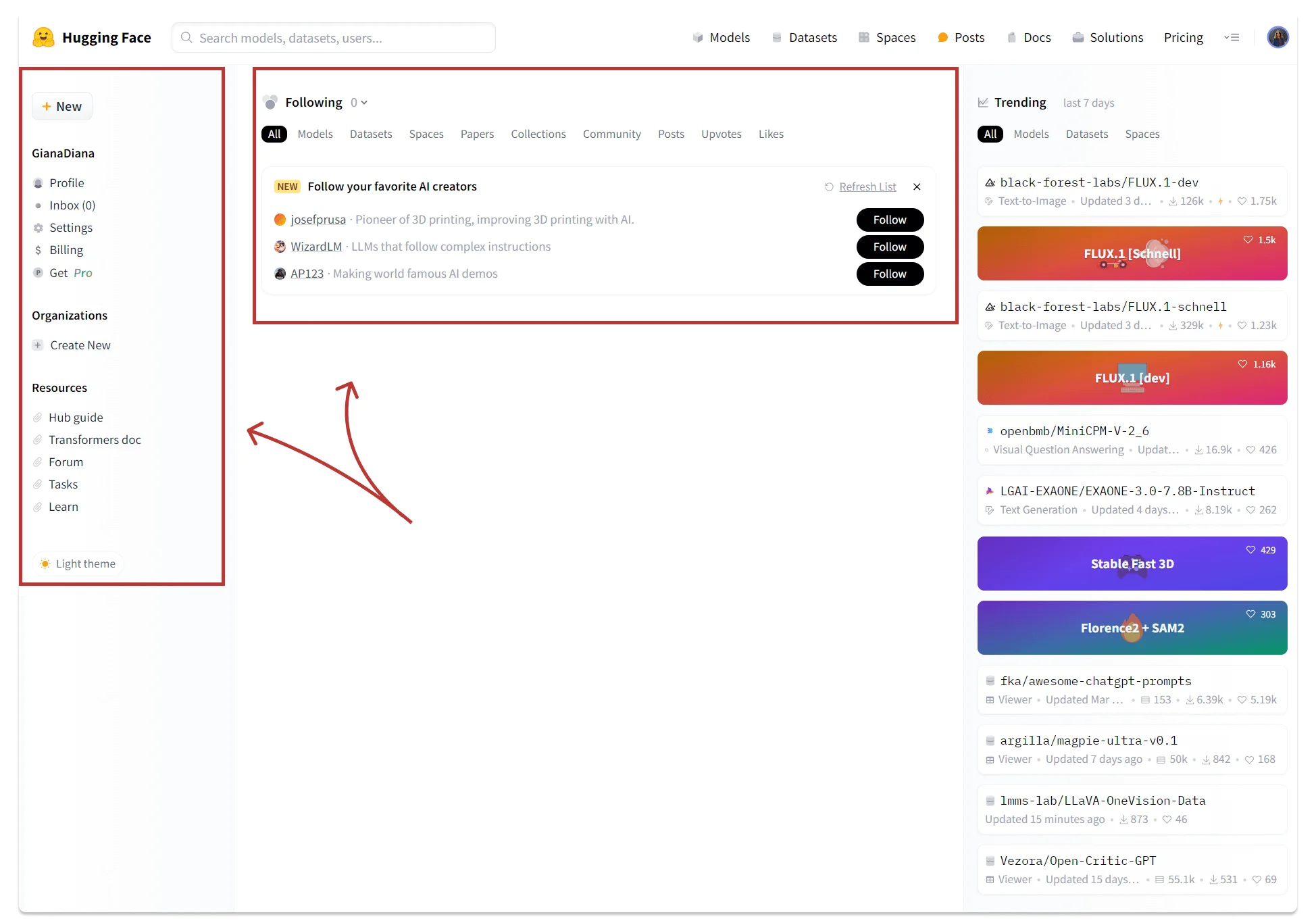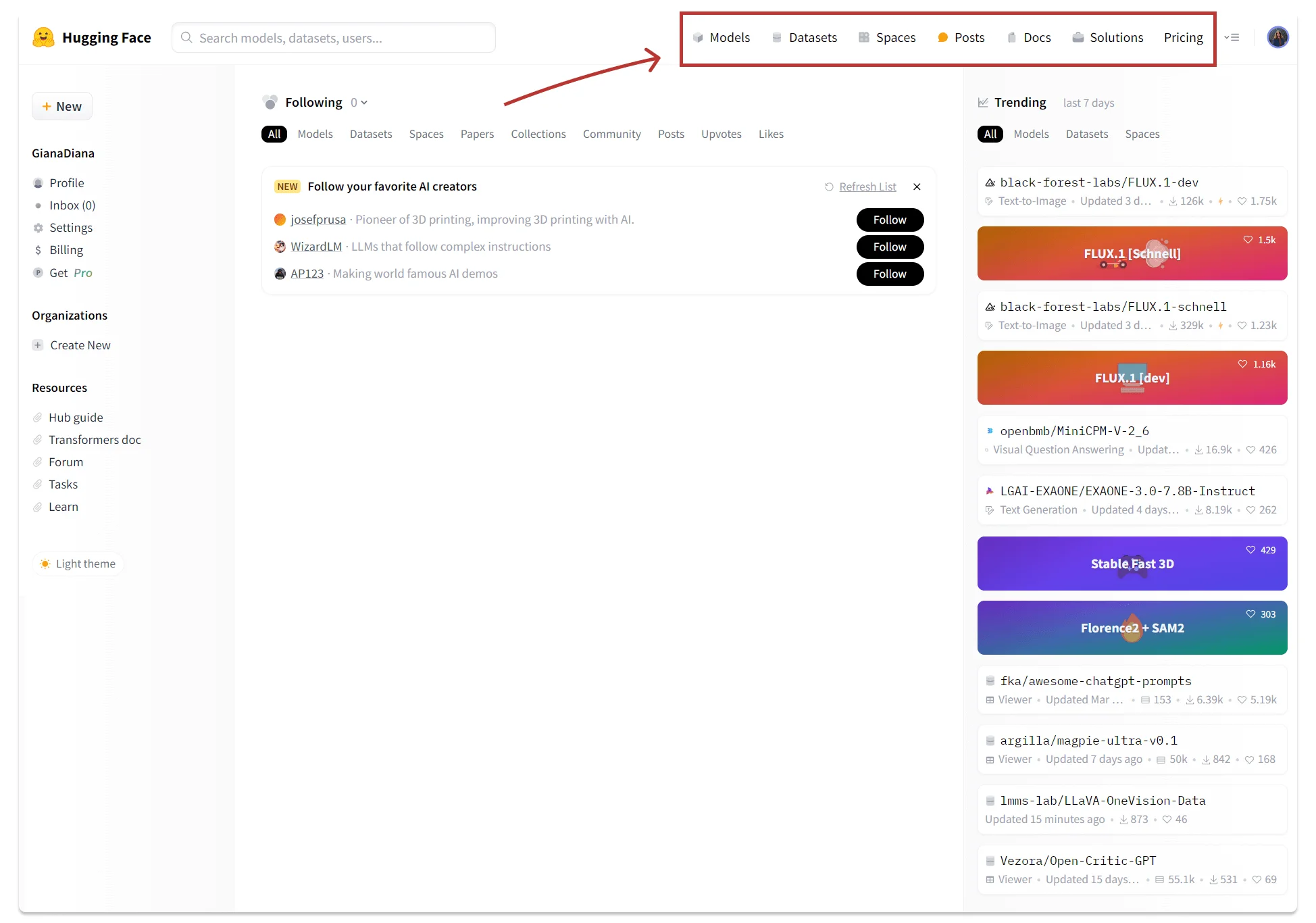 В интерфейсе Hugging Face множество разделов для разных задач. Еще есть лента с постами пользователей, лайки, свой профиль — все, что нужно для целого комьюнити. Разберемся по порядку, где что искать.