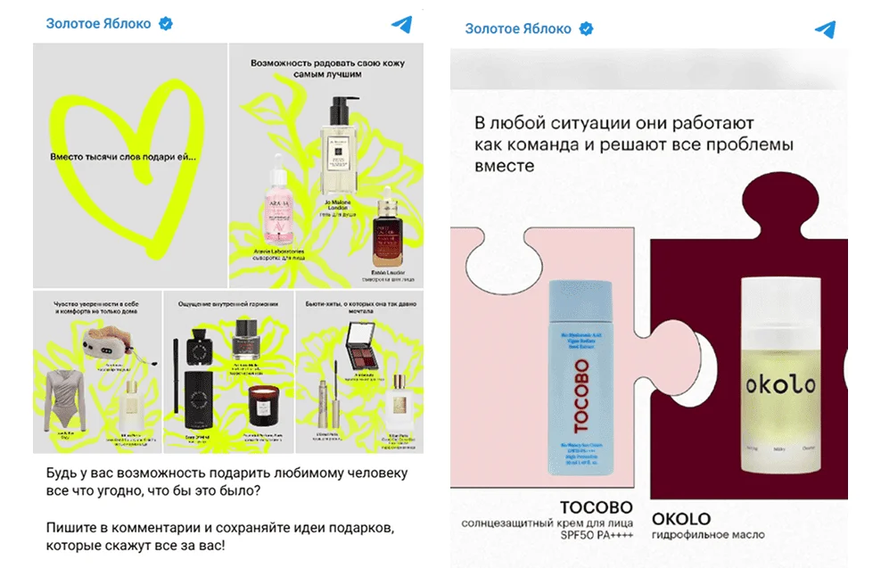 В канале «Золотого яблока» опубликовали подборку подарков для неё, в которую вошли косметические продукт и другие товары. В комментариях попросили подписчиков поделиться, что бы они подарили любимому человеку. Ещё одна идея — пары товаров с идеальным мэтчем.