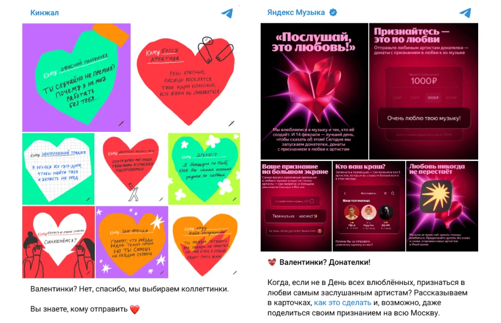 Более свежо и интересно получается, когда бренды адаптируют универсальные валентинки и делают их более нишевыми. Например, в Кинжале придумали коллегтинки с признаниями для коллег, а Яндекс Музыка предложила подписчикам донателки — донаты с признанием в любви артистам.