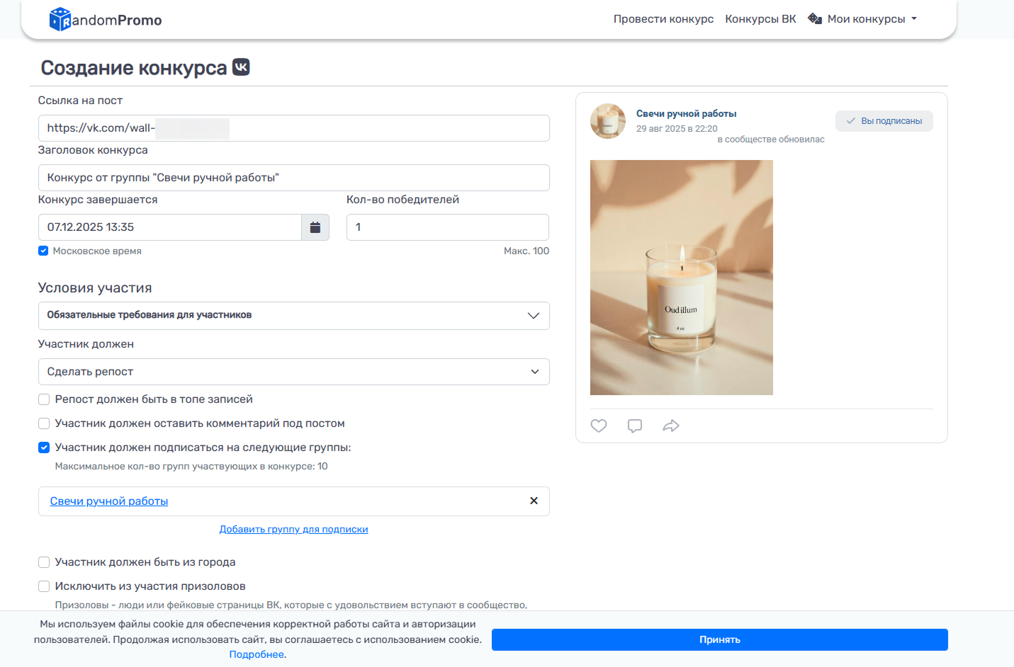 Для создания конкурса нужно авторизоваться в профиле через аккаунт ВКонтакте, указать ссылку на пост с описанием розыгрыша и настроить параметры выбора победителя.