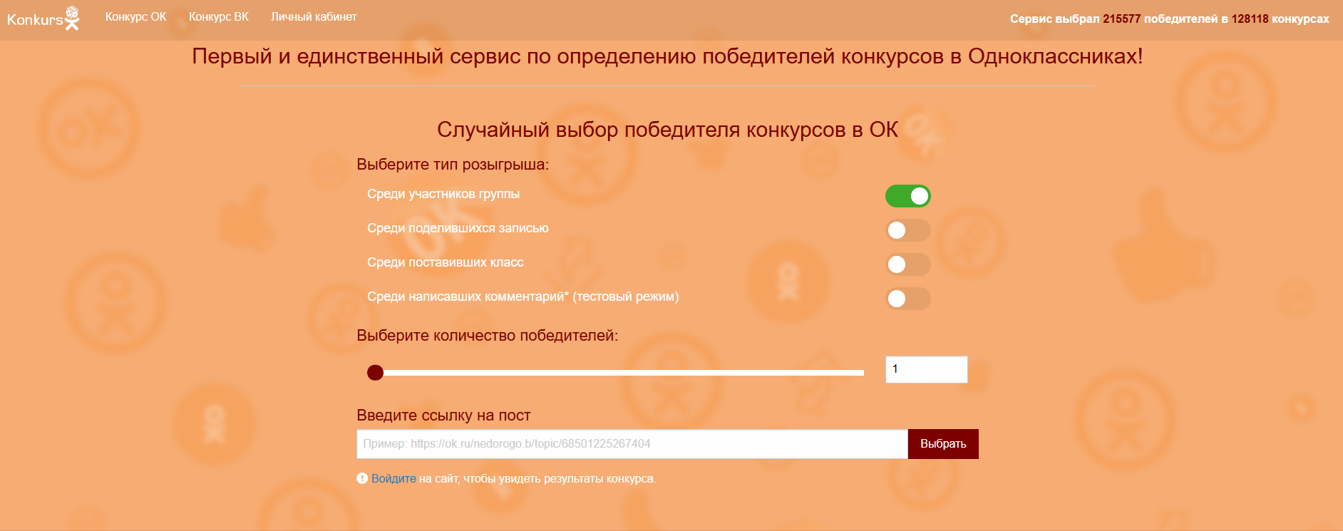 Подходит для конкурсов в Одноклассниках и ВКонтакте. Чтобы выбрать победителя, нужно указать ссылку на пост и настроить условия розыгрыша.