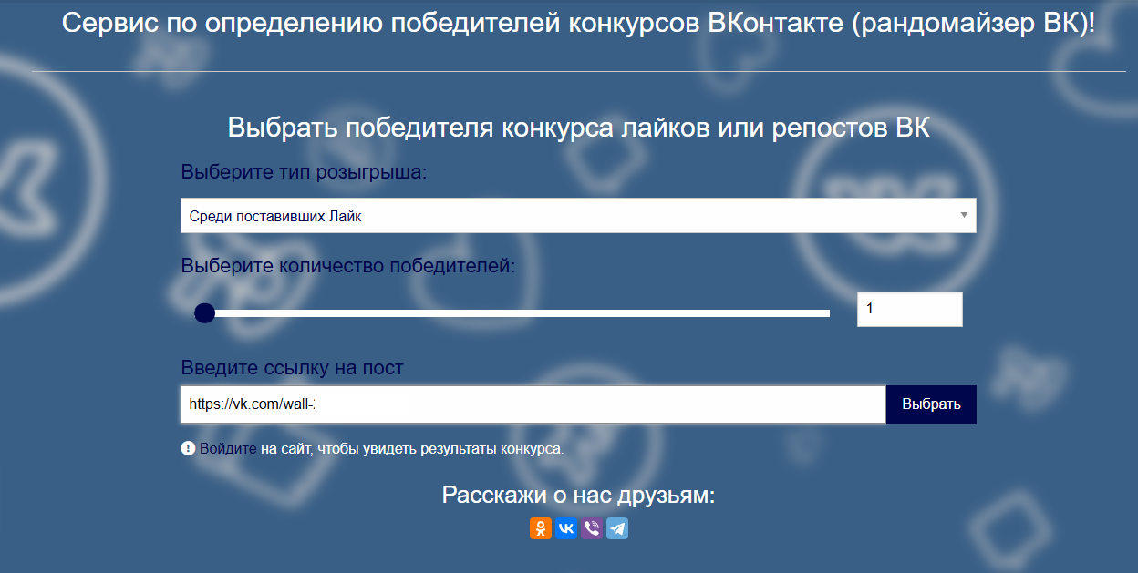 Для определения победителя нужно добавить ссылку на пост и авторизоваться через аккаунт той социальной сети, где идет розыгрыш.
