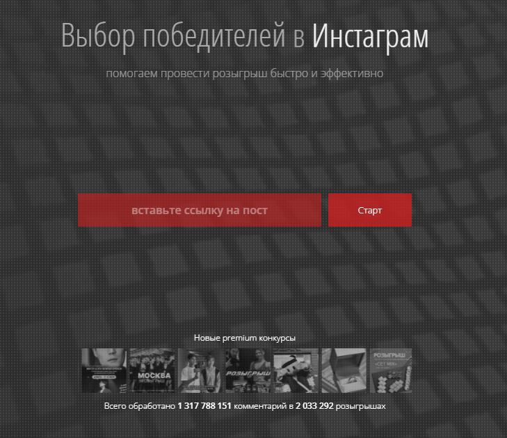 Простой сервис для конкурсов в Instagram*, не требует авторизации и введения пароля от аккаунта. Один и тот же розыгрыш можно проводить несколько раз, выбирая новых победителей. Есть только платные тарифы.