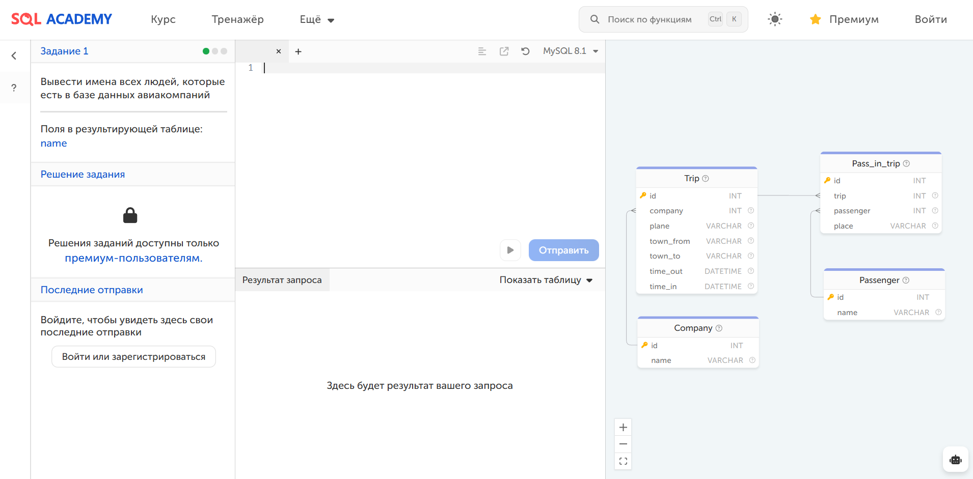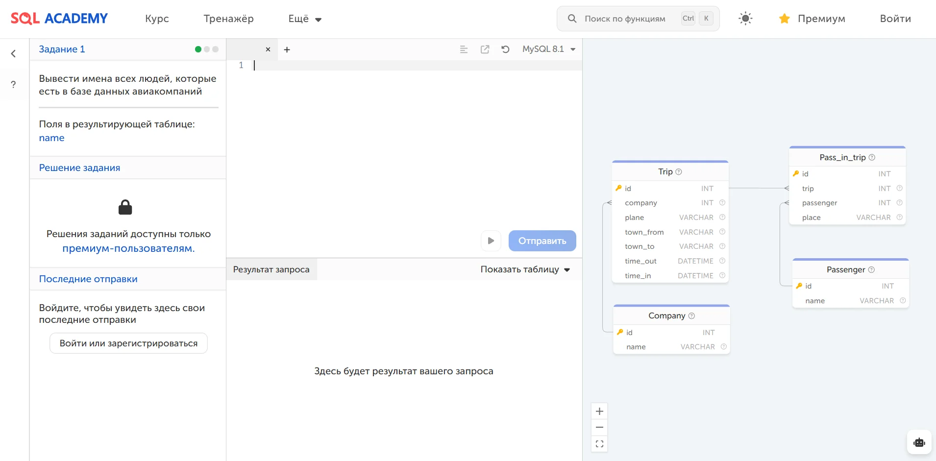 На курсе студенты учатся работать с базами данных через практические задания, приближенные к реальным профессиональным задачам — это интерактивное обучение, которое работает эффективнее обычных лекций, так как знания сразу закрепляются на практике через решение более 130 SQL-упражнений и задач с собеседований крупных компаний.
