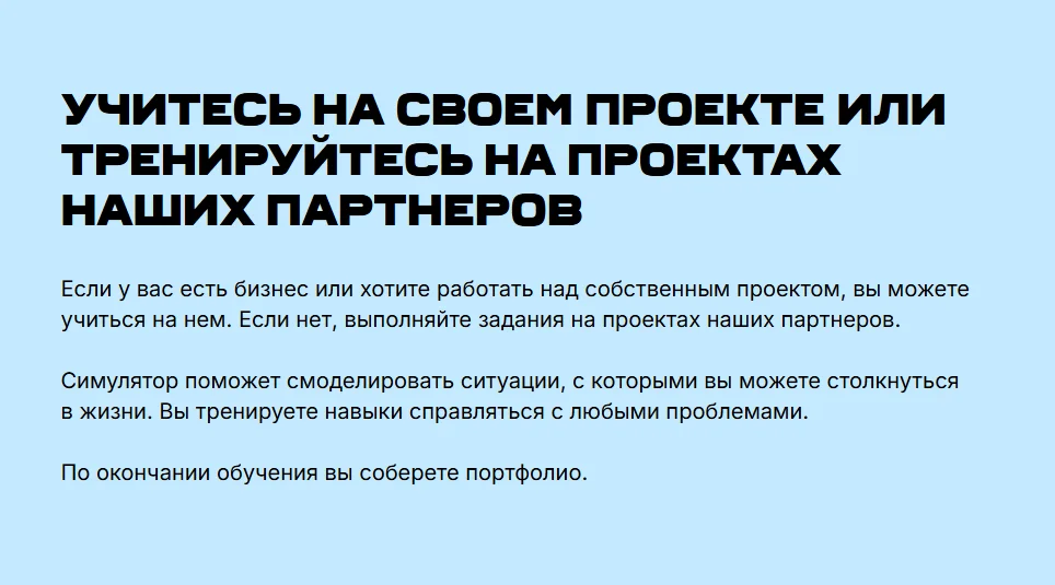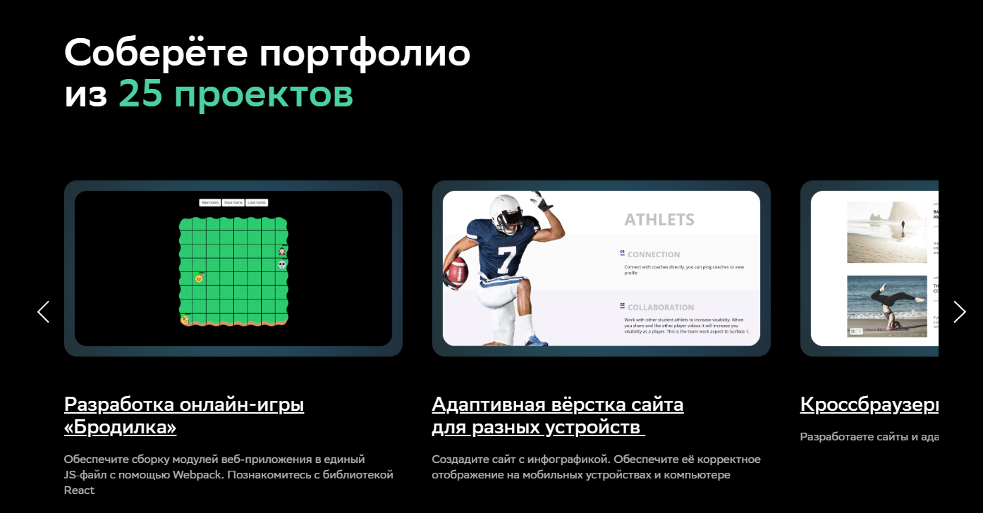 Студенты также соберут портфолио из 5 или 7 проектов в зависимости от выбранного тарифа и получат поддержку в трудоустройстве.