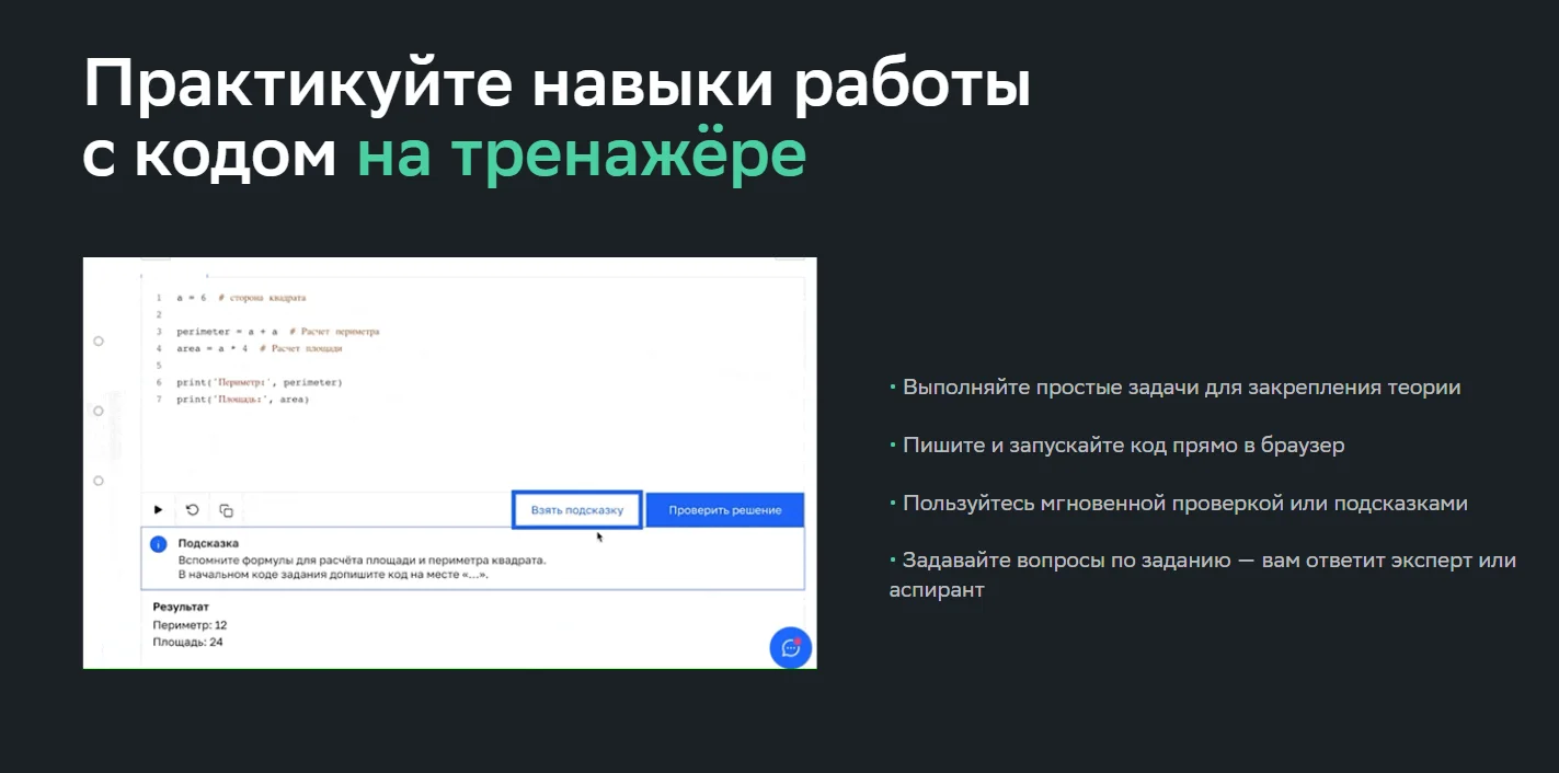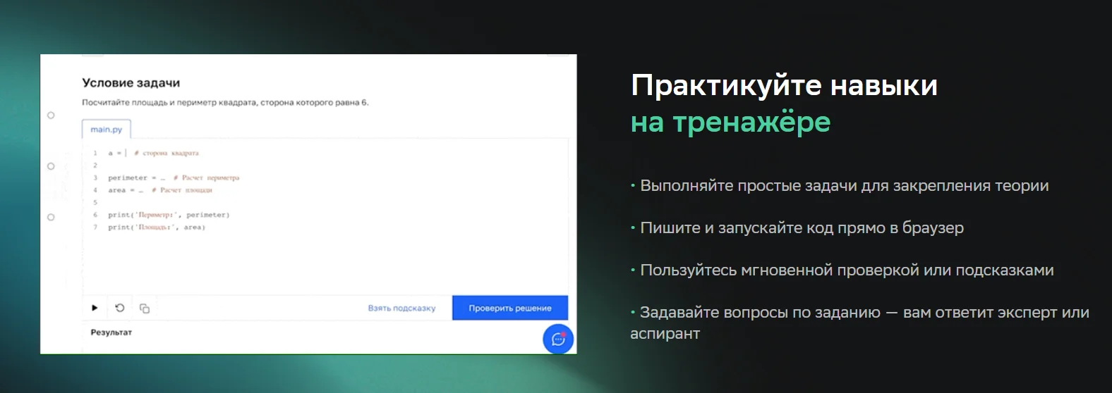 Практические занятия проходят на тренажёре. С его помощью студенты смогут развивать свои навыки программирования, писать код, разрабатывать веб-приложения, работать с ошибками и т.д.