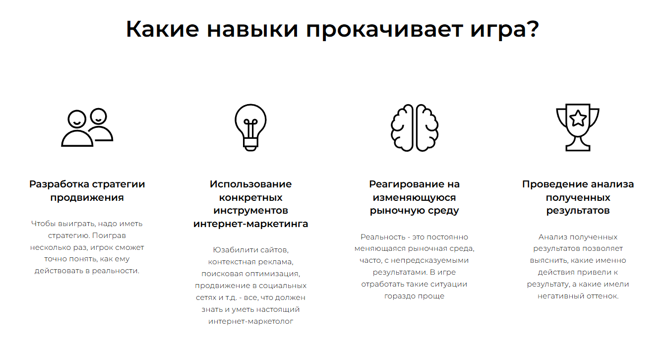 Это не курс, а деловая онлайн-игра для тех, кто хочет прокачать софт- и хард-скиллы маркетолога. Суть игры — смоделировать продвижение бизнеса в интернете.