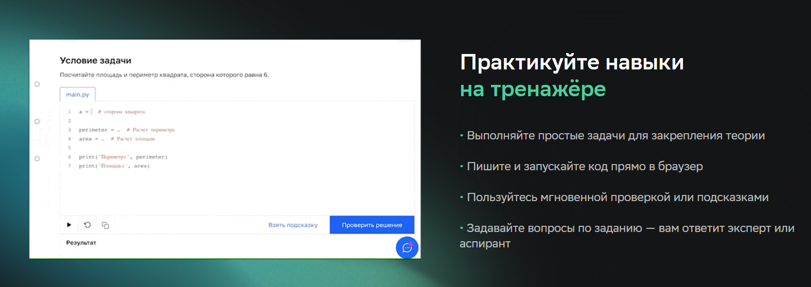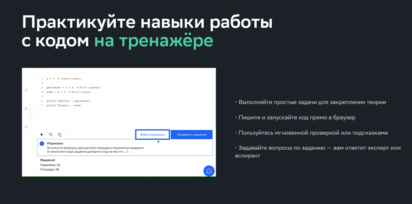 Практические занятия проходят на тренажёре. С его помощью студенты смогут развивать свои навыки программирования, писать код, разрабатывать веб-приложения работать с ошибками и т.д.