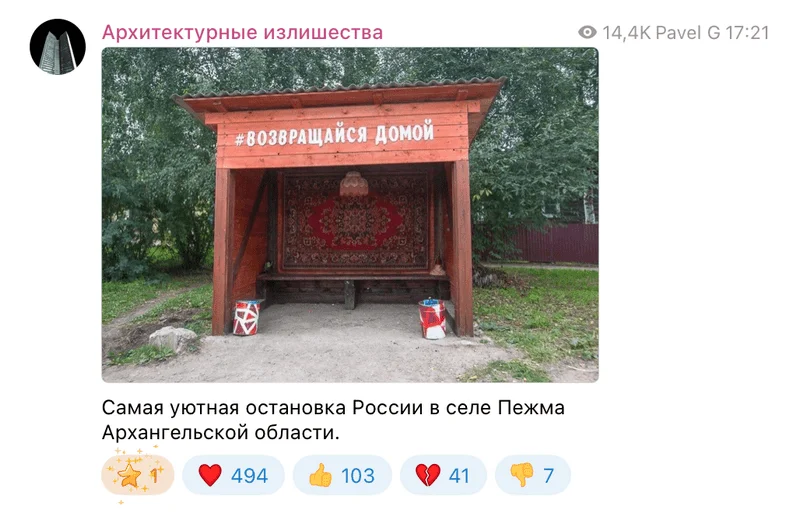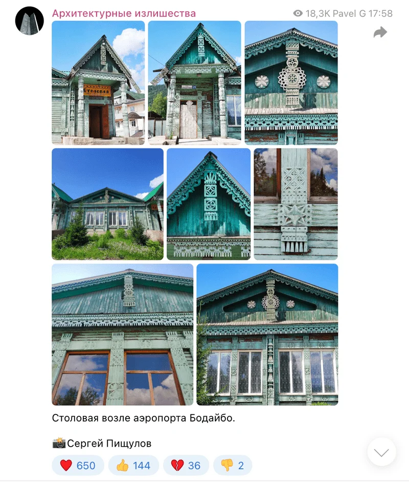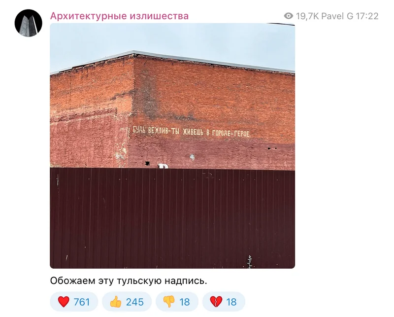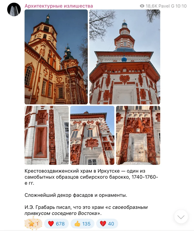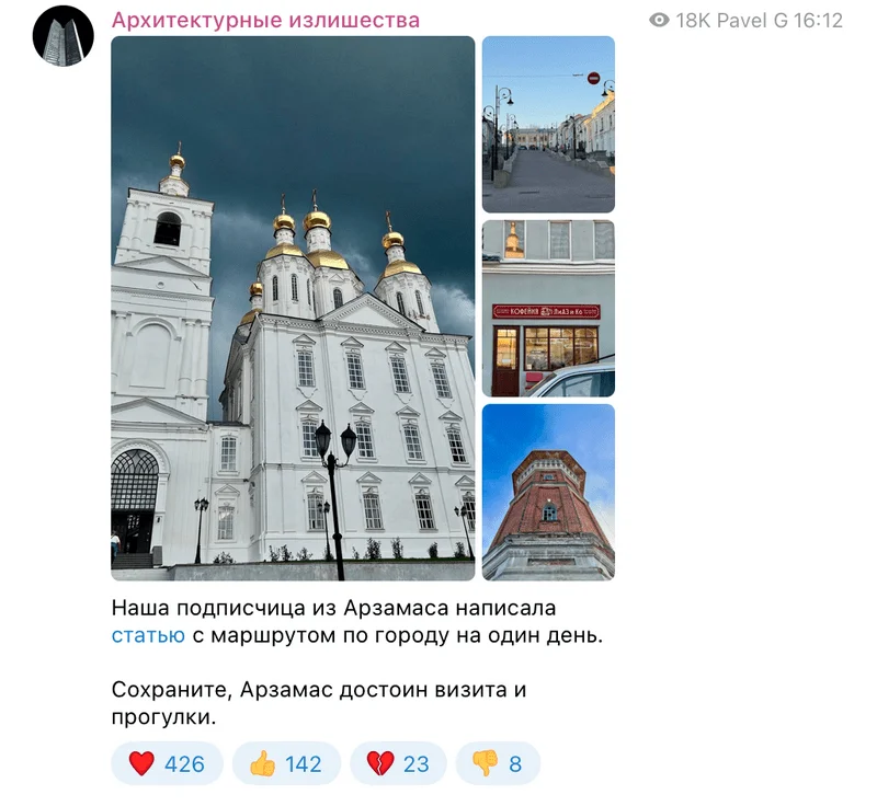 Прекрасно понимаю, что наш канал — это скорее архитектурное «Пикабу», где мы пишем обо всём, но если углубляться во что-то очень нишевое, это будет канал на 3000 подписчиков, а не на 100. Мы выбрали другой путь: комбинируем темы, жонглируем форматами, рассказываем не только про архитектуру, но и про историческую недвижимость, сувениры, кухню и внутренний туризм. С большим удовольствием пишу о барах в старинных зданиях или о людях, которые вложились в родной регион.