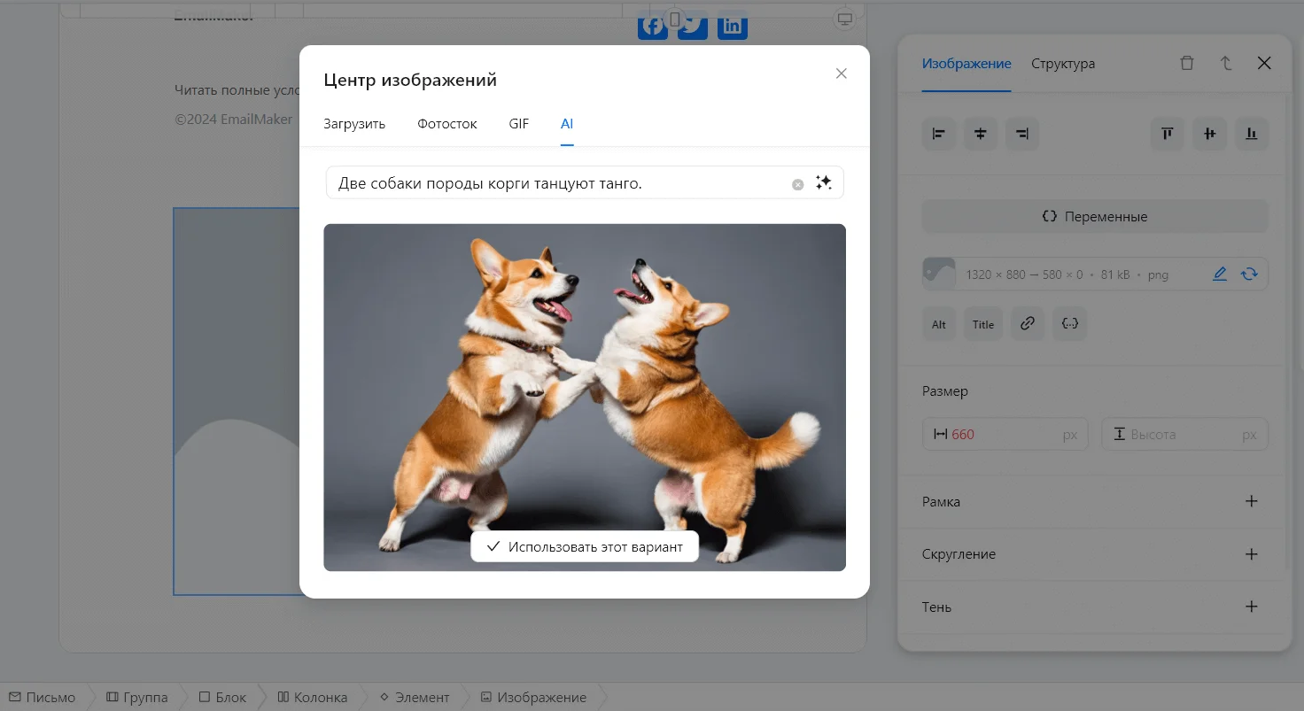 Кстати, если для создания красивой вёрстки вам не хватает красивых картинок, встроенный в конструктор ИИ и тут поможет. В EmailMaker, который встроен в Unisender, можно сгенерировать изображение прямо внутри редактора.