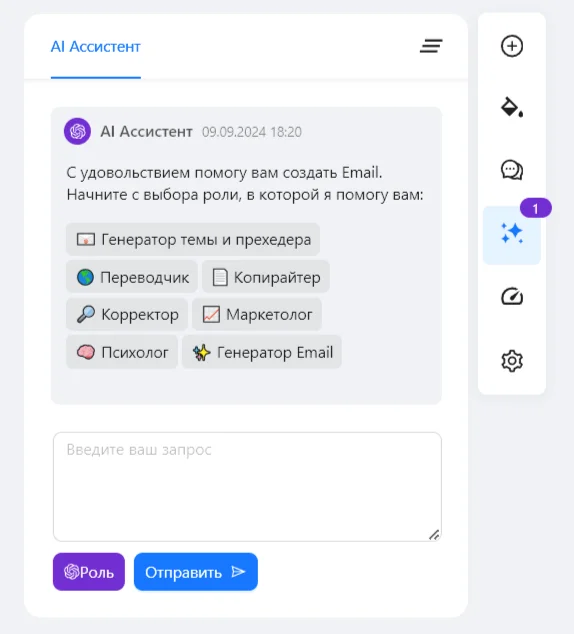 В некоторых конструкторах рассылок уже есть встроенные ИИ-инструменты. Например, в EmailMaker от Unisender можно воспользоваться ИИ-помощником: он может выступить в роли копирайтера, переводчика и генератора тем и прехедеров.