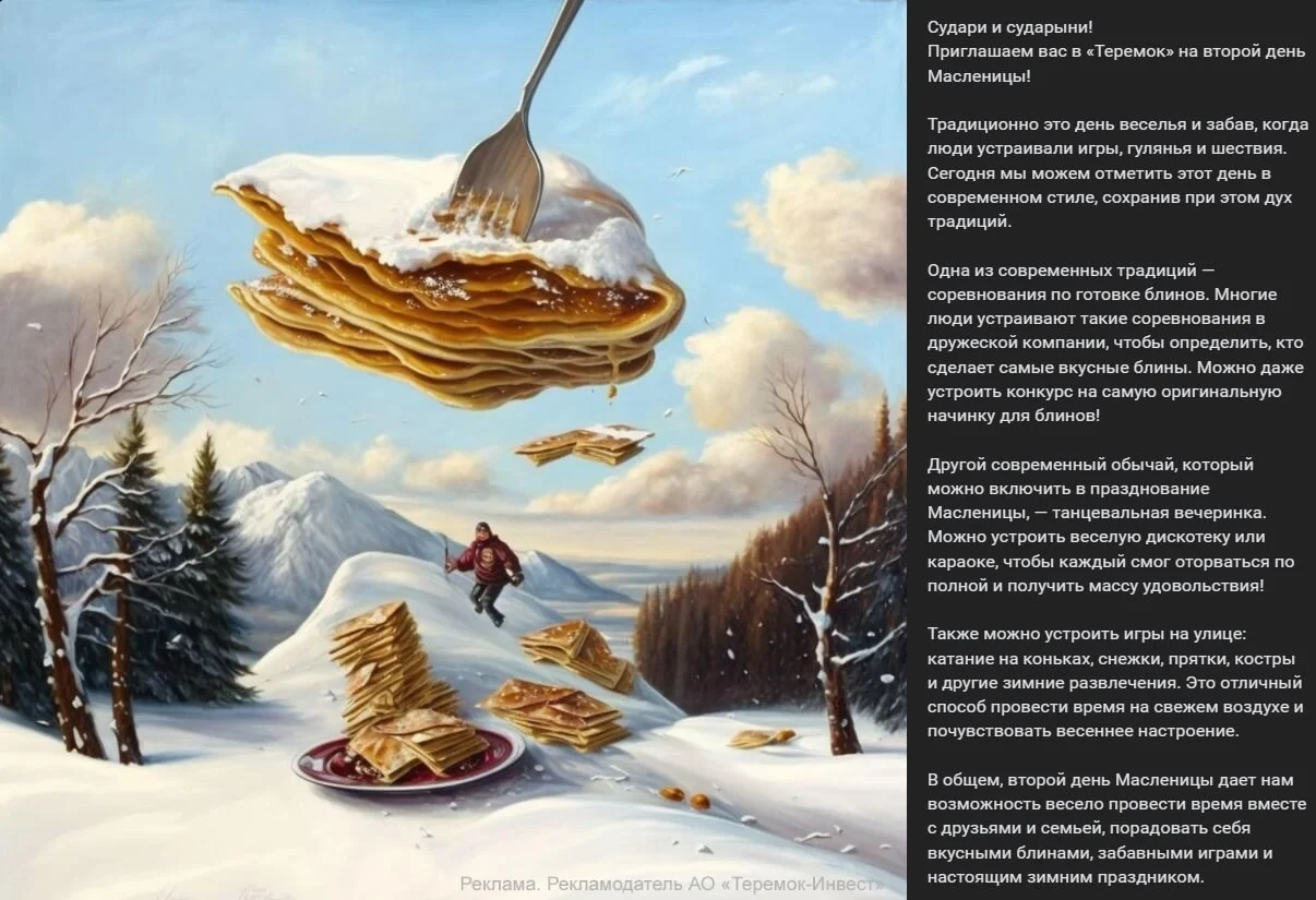 В преддверии Масленицы сеть ресторанов русской кухни «Теремок» наполнила соцсети контентом, который сгенерировали нейросети. Текст для поста написал популярный чат-бот с искусственным интеллектом ChatGPT, картинки генерировали в программах Midjourney и Stable Diffusion.
