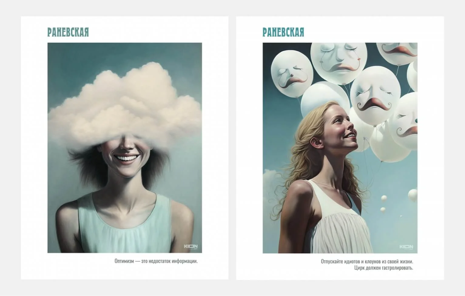 К выходу сериала «Раневская» онлайн-кинотеатр KION сделал постеры с помощью искусственного интеллекта. Для создание постеров креативщики отправили нейросети Midjourney запросы с цитатами советской актрисы Фаины Раневской и получили необычные иллюстрации. Сгенерированные постеры разместили в фойе Театра им. Моссовета, в котором Раневская прослужила 25 лет.