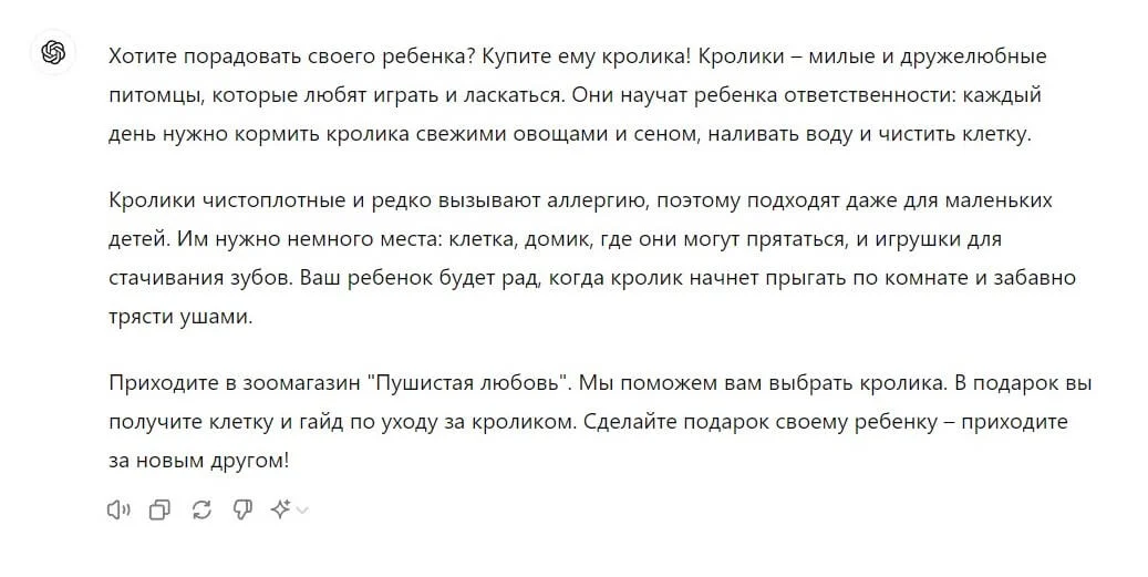 Попросим ChatGPT написать текст для видеорекламы зоомагазина «Пушистая любовь». Задача текста — помочь родителям разобраться, почему детям нужно купить питомца и именно в этом зоомагазине.