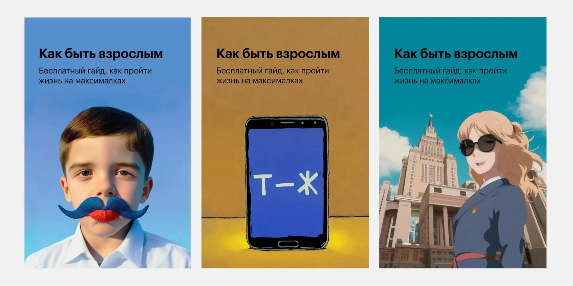 Для нового курса учебника «Как быть взрослым» создатели поставили цель: привлечь в 5 раз больше студентов, чем в прошлом месяце. Для этого за несколько недель сгенерировали в нейросети 23 иллюстрации и отправили на A/B-тестирование. Желаемые показатели получили с первой же итерации: примерно треть баннеров дала нужное количество переходов. А конверсия оказалась в районе 25—30%.
