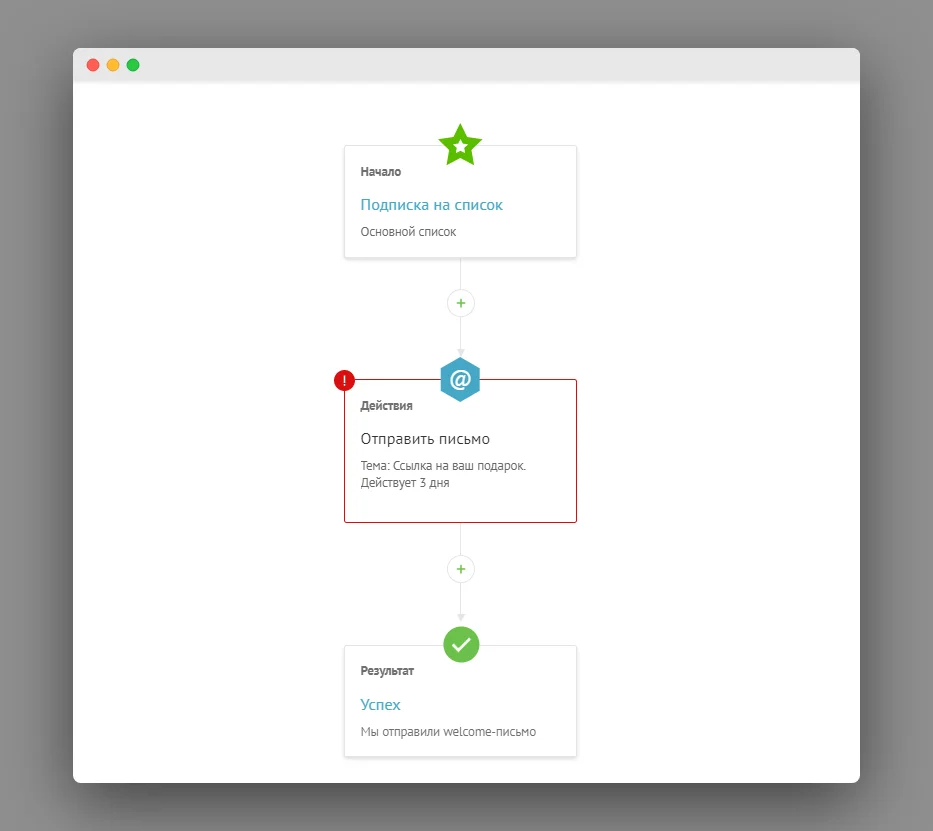 Пример из автоматизации Unisender. Письмо с подарком автоматически придёт подписчику, когда он подпишется на «Основной список»