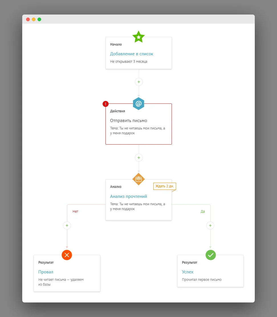 Реактивация. С помощью сегментации находим всех, кто не открывал письма последние 3 месяца и переносим их в новый список. Настраиваем автоматическое письмо, которое уходит, если подписчик попадает в этот список: