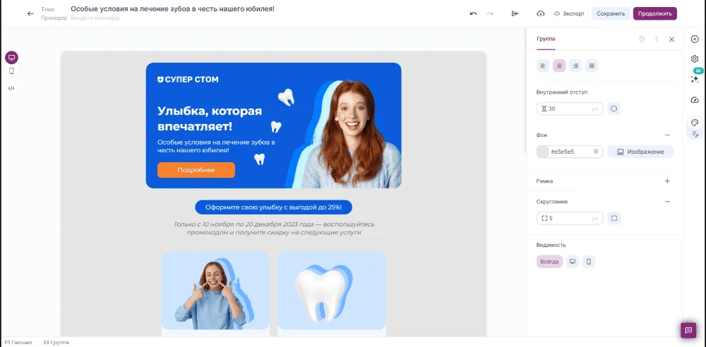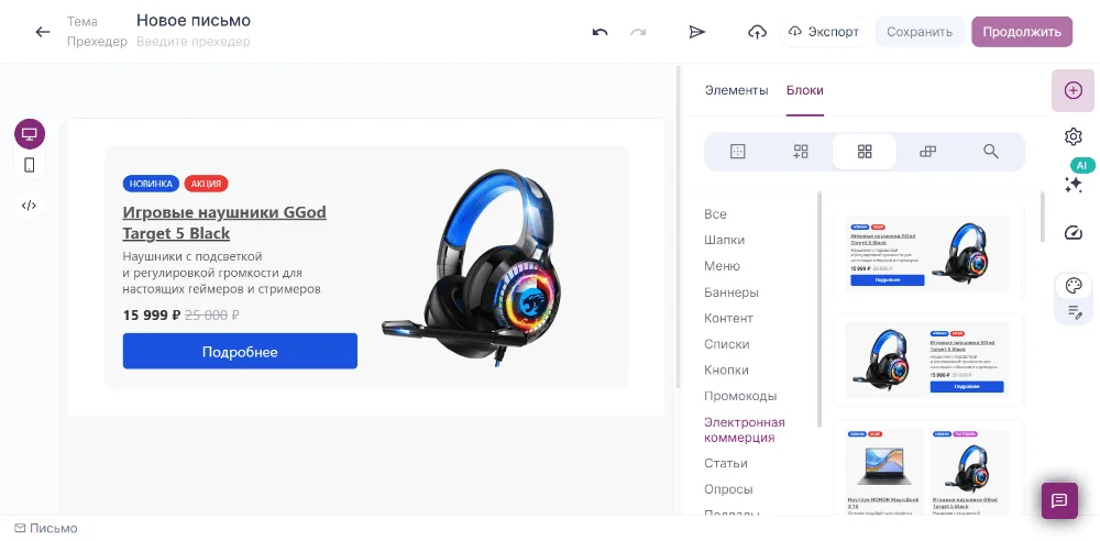 Если необходим уникальный вариант, то можно создать свой шаблон с нуля в визуальном конструкторе сервиса email-рассылок. Такой кастомный шаблон может включать уникальные элементы дизайна, цветовую палитру и шрифты, отвечающие фирменному стилю. Результат можно сохранить для повторного использования.