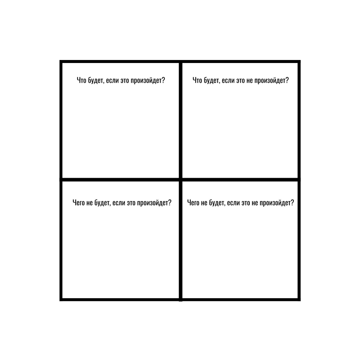 Квадрат Декарта помогает организовать известную информацию и рассмотреть разные аспекты проблемы. Метод даст ответы на вопросы: Что будет, если это произойдет? Что будет, если это не произойдет? Чего не будет, если это произойдет? Чего не будет, если это не произойдет? На основе ответов можно принять обоснованное решение.