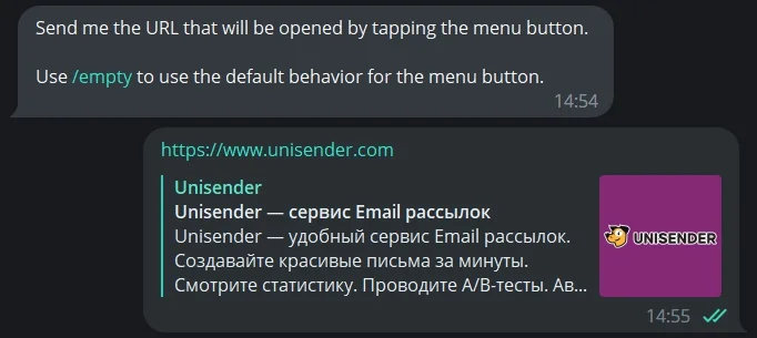 @BotFather запросит ссылку, по которой нужно будет переходить при нажатии кнопки. Укажите ее в ответ.
