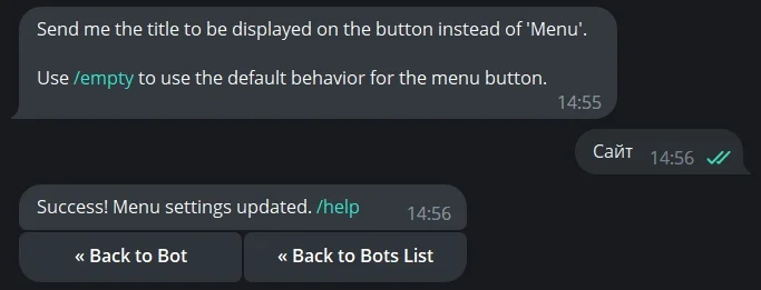 Затем запросит текст, который должен быть указан вместо стандартного «Меню». Введите название кнопки.