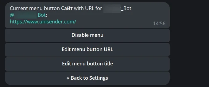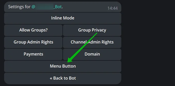 Для этого также используем команду /mybots. Выбираем бота и жмем «Bot Settings». И выбираем «Menu Button».