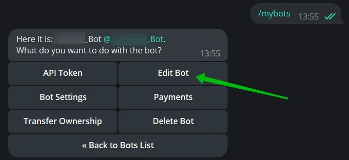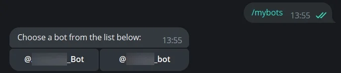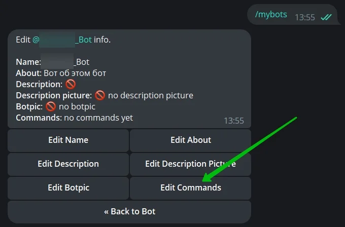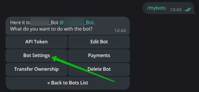 Для этого снова используем команду /mybots. Выбираем бота и жмем «Bot Settings».
