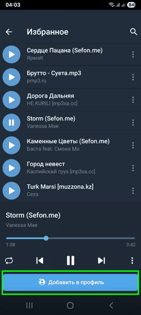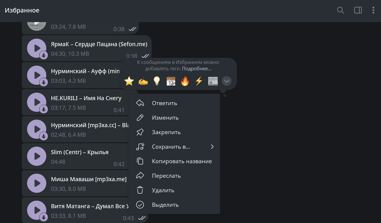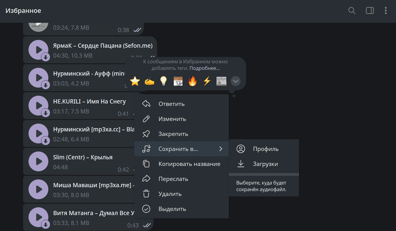 То есть на десктопе добавление трека в плейлист осуществляется через контекстное меню в чате, а на мобильных устройствах выполняется через медиаплеер. И в том, и в другом случае результат будет одинаковым — аудиофайл будет добавлен в плейлист профиля.