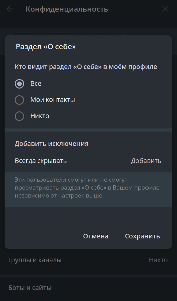 Дополнительно можно настроить исключения для конкретных пользователей. К примеру, при выборе группы «Все» добавить пользователей, от которых раздел «О себе» всегда будет скрыт. Если же выбрана группа «Никто», то можно указать пользователей, которым информация наоборот будет доступна.
