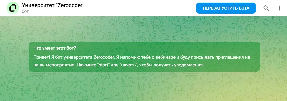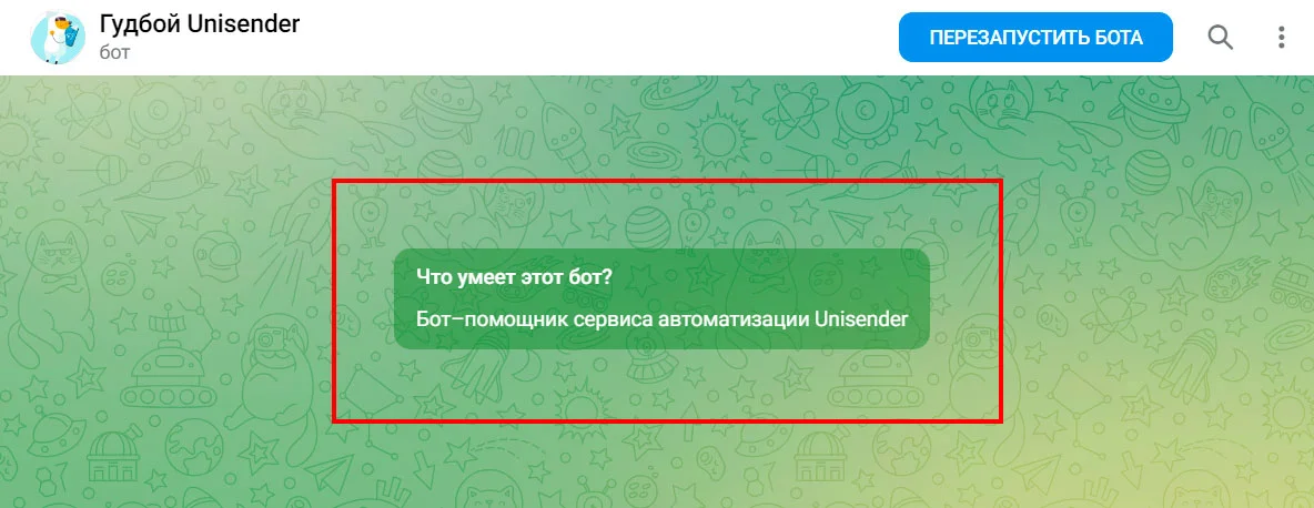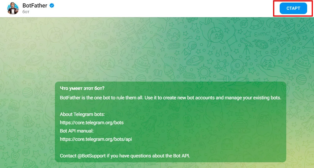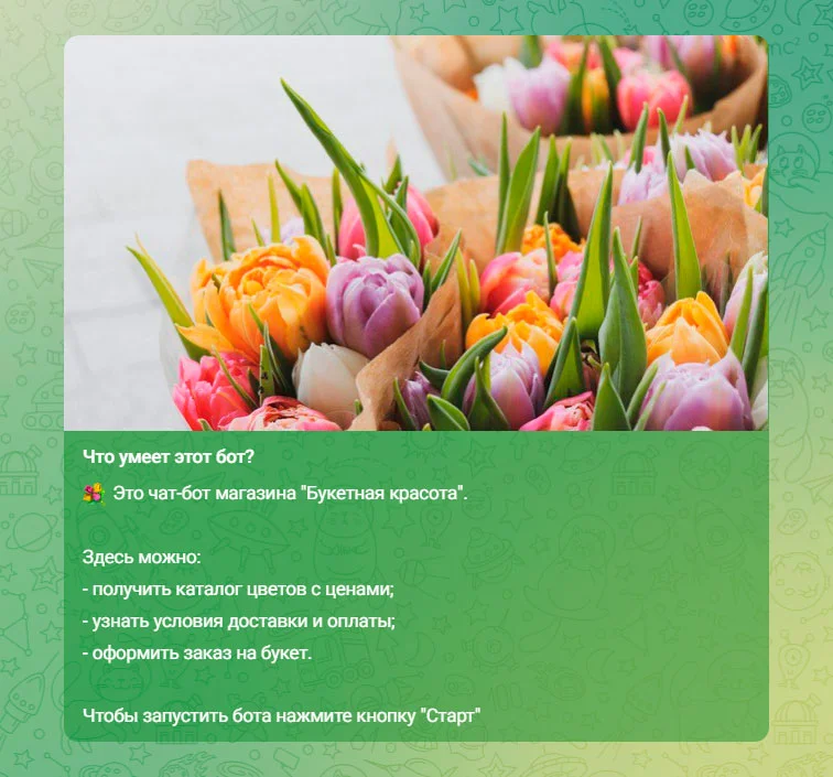 А может быть так, что пользователь недавно установил Telegram и ещё в нём не освоился, но услуги вашего бота уже нужны. Поэтому в описание чат-бота стоит добавить инструкцию по его запуску. А если нужно, продолжить помогать и в приветственном сообщении.