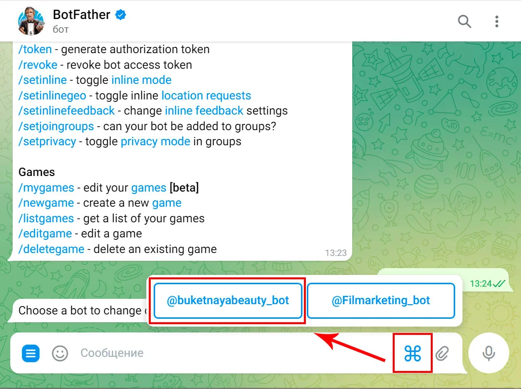 Сервис предложит выбрать чат-бота, для которого нужно изменить или добавить описание. В web-версии Telegram наведите курсор на значок ⌘, чтобы увидеть ваших ботов.