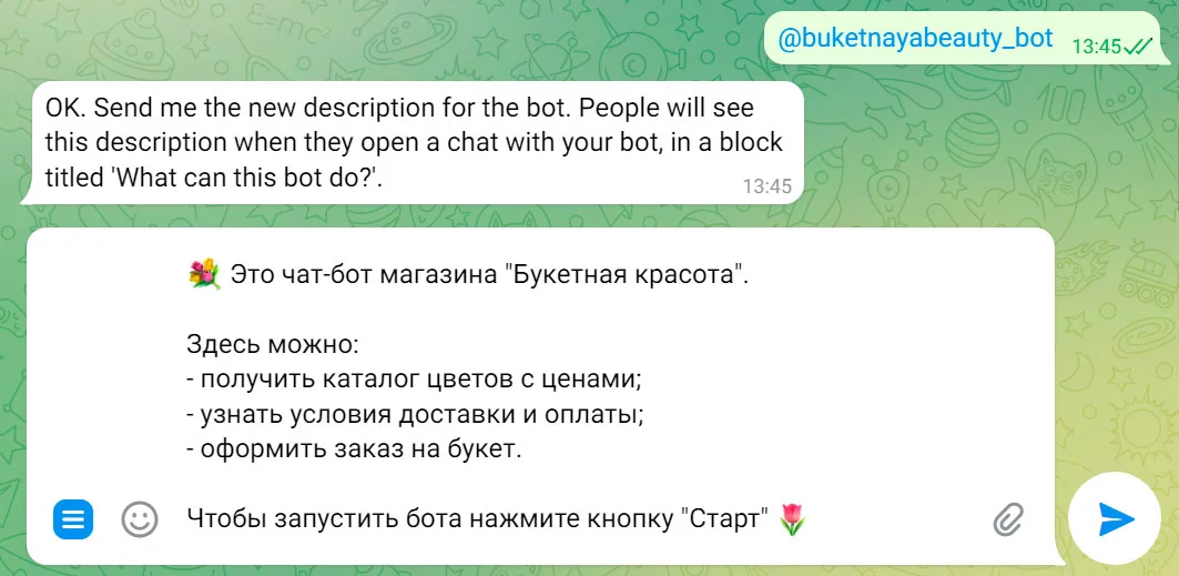 Дальше BotFather предложит прислать новое описание бота. Напишите, оформите и отправьте ему текст.