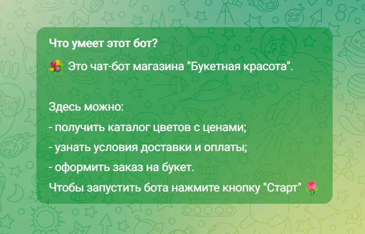 Что умеет делать бот. Напишите, что пользователь может сделать в боте, какие услуги или выгоды получит. Эта информация поможет принять решение, стоит ли взаимодействовать с чат-ботом дальше.