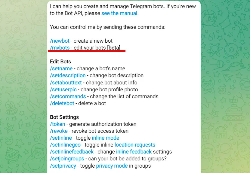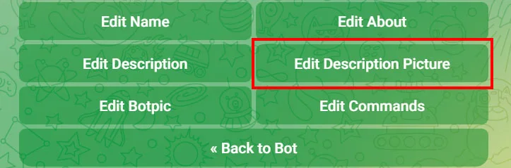 BotFather пришлёт список команд. Нам нужна /setdescription — нажимаем.